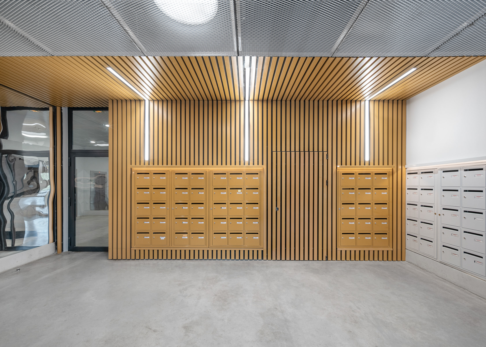 Réhabilitation de la résidence Les Aubiers dans le cadre du projet de renouvellement urbain porté par la métropole de Bordeaux. Cette intervention architecturale ambitieuse repense les parties communes afin de les rendre plus lisibles, accessibles et accueillantes. Le socle du bâtiment a été activé par l'intégration de commerces et de services de proximité, contribuant ainsi à une meilleure ouverture sur le quartier. Le projet vise à reconnecter la résidence à son environnement urbain immédiat et à renforcer la dynamique locale, en favorisant les usages collectifs et la mixité des fonctions au sein du tissu existant.